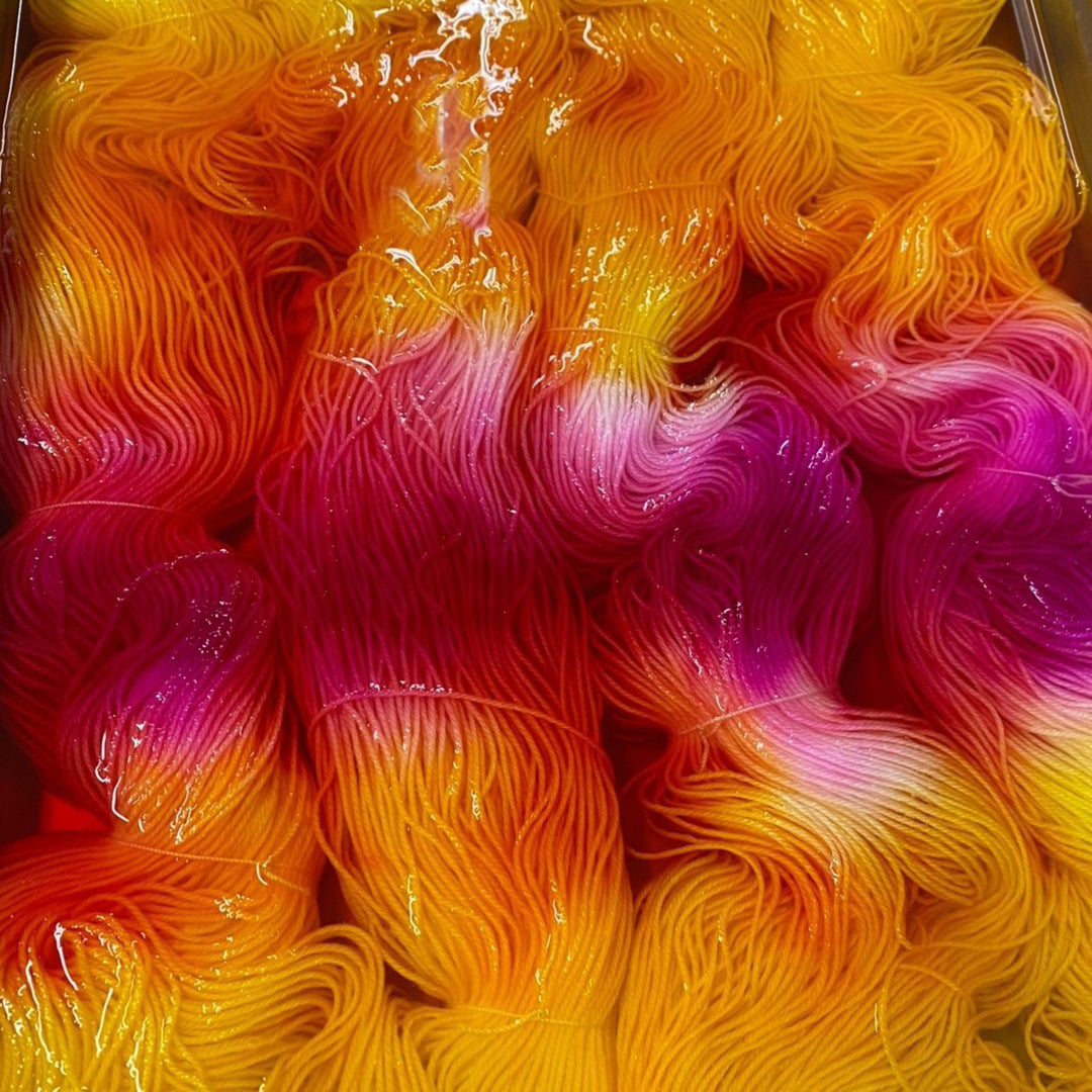 Every skein begins as a canvas. Sometimes it becomes a soft tonal wash, other times a lively speckle storm, or a layered dance of shifting hues. I explore them all — from gentle fades to bold, multi-colored bursts — so your stitches tell their own story.