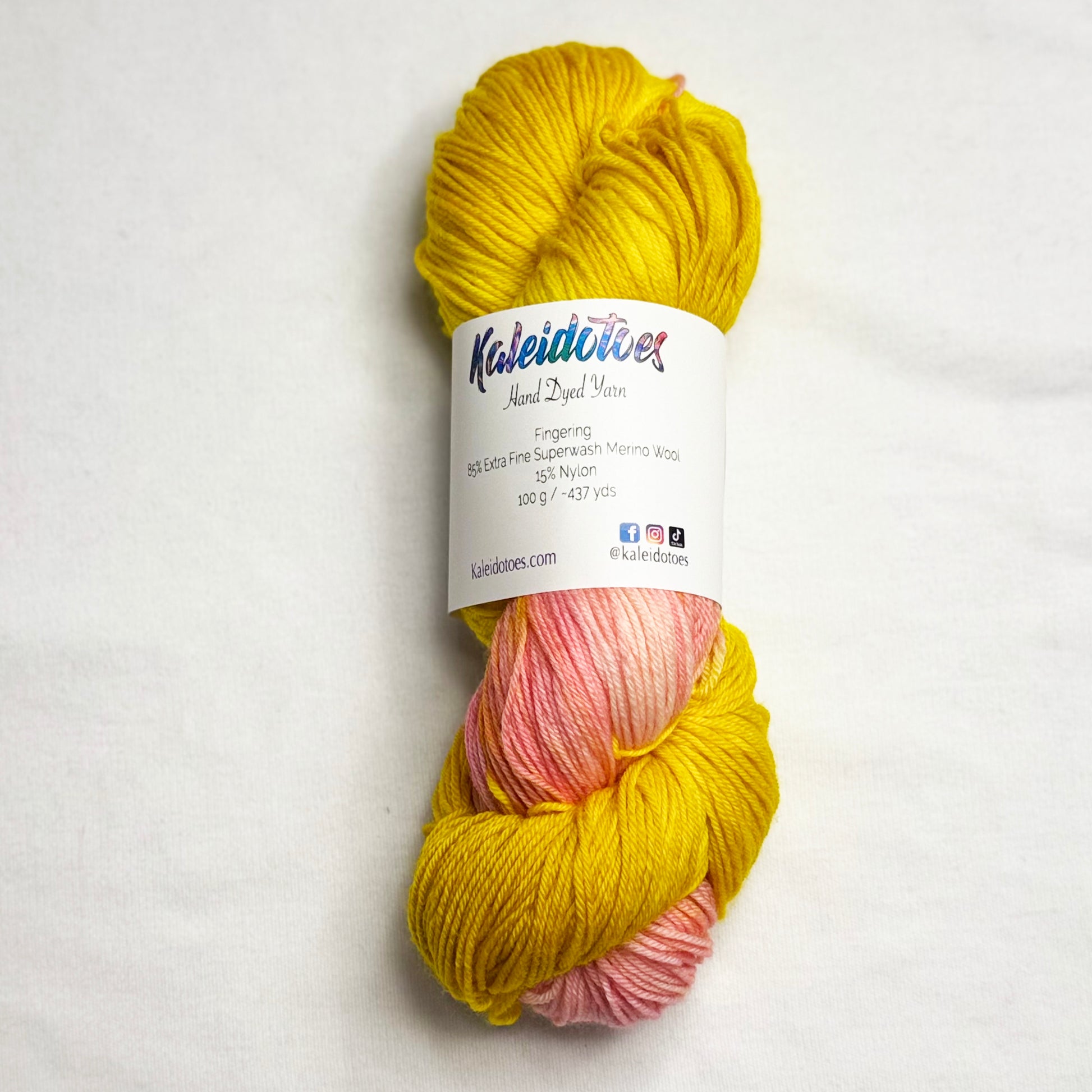 A sunshine-sweet skein with a playful touch. Lemondrop Kisses glows in rich yellow and golden hues, warmed with gentle soft pink highlights that melt into the brightness. Like the warmth of a golden afternoon wrapped in a tender kiss, this colorway radiates joy and charm.